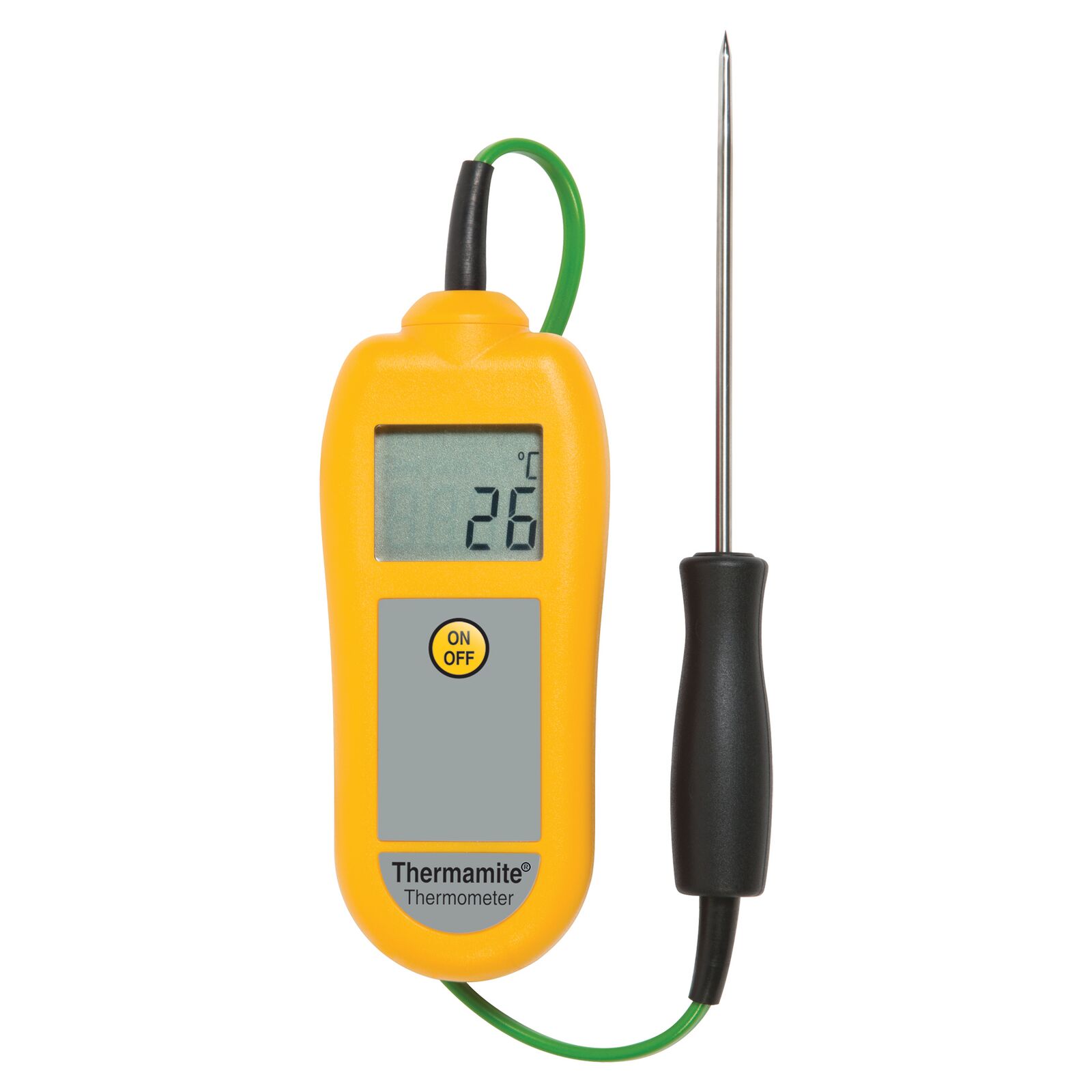 Dette “Thermamite” termometer har et stort og klart LCD display og måler temperaturer fra -50 til +300°C med en opløsning på 1°C.
